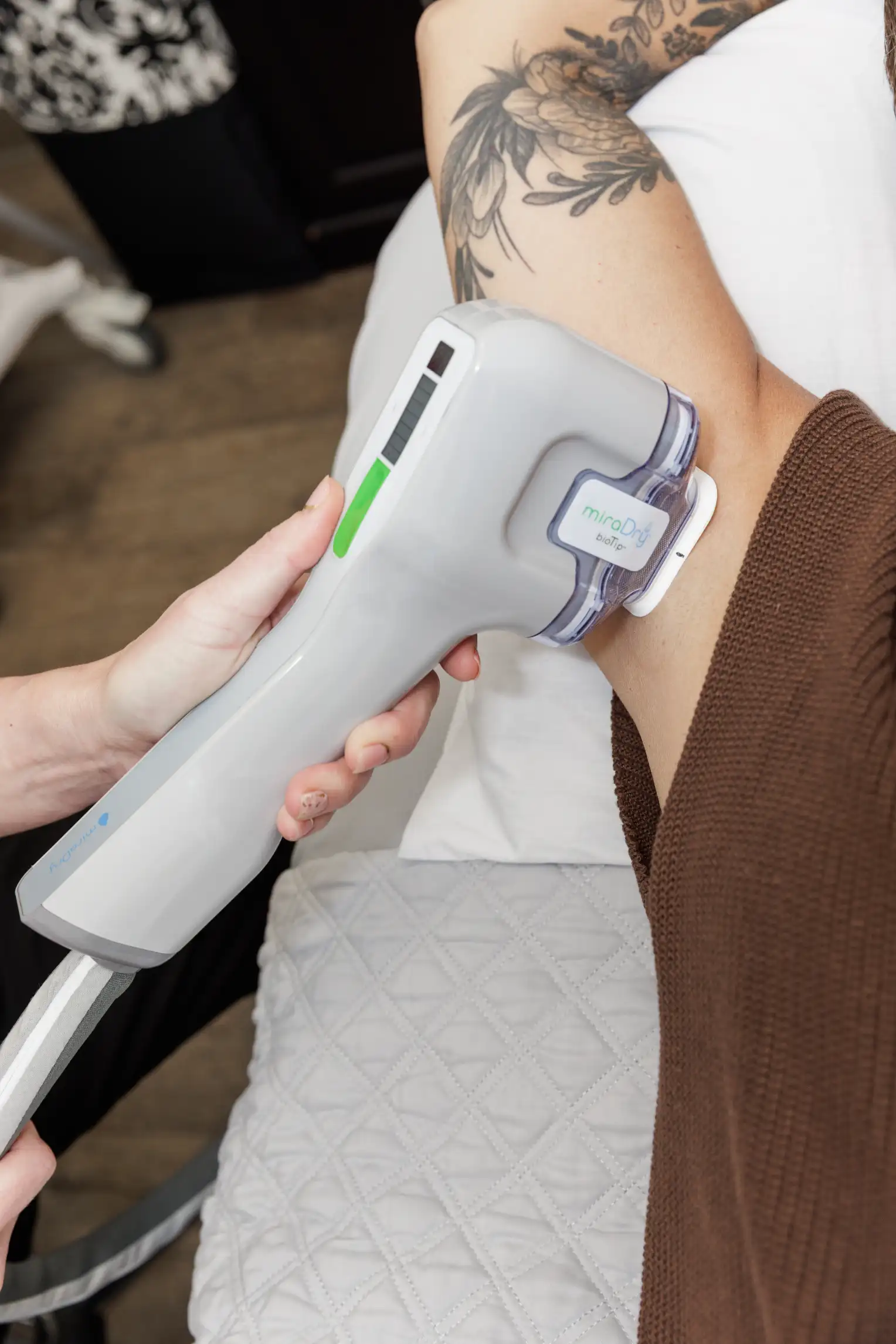 MIRADRY® treatment, a safe, noninvasive treatment that treats the underlying causes of underarm sweating and odor, helping you feel dry and fresh for good.