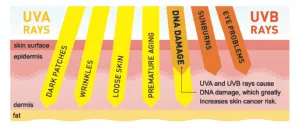 I have used the term “broad-spectrum sun protection” several times in this post. Before we can understand what that means, let’s first talk about the difference between UVA and UVB rays. UVA rays make up 95% of UV radiation that reaches the Earth’s surface. While UVA is not as strong as UVB rays, they are 30-50% more prevalent. UVA penetrates past the epidermis and into the dermis. They contribute to premature aging, hyperpigmentation, and cellular damage causing skin cancers. UVA can also penetrate clouds and glass thus why it is very important to wear sunscreen even if you spend much of your time traveling in vehicles. UVA is also the dominant tanning ray. Any time your body responds to the sun with a tan, your skin has been damaged at a cellular level. A tan is your body’s attempt to try and halt further cellular damage. UVA rays also remain consistent year-round.